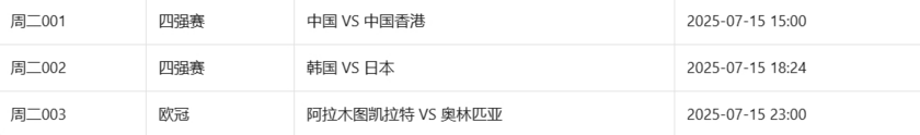 周二-周四,东亚杯火热开战,期待中国女足取得开门红!世俱杯两场半决赛引人注目!欧冠、欧联杯资格赛重回视野!梅西火热状态能否带领迈阿密高歌猛进,都非常值得期待!球迷狂欢👉新人享376礼包!送5天冷门预警+专家风向标!