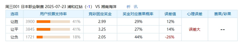 本场比赛中,选择浦和红钻让球负的球迷偏少了,只有18%的球迷选择让球负选项,这场比赛中,大家都看好主队浦和红钻能够赢或者大胜赢得这场比赛,不看好湘南海洋能在客场保住分数,但是这也与奖金对应赛果概率的44%相差28%。