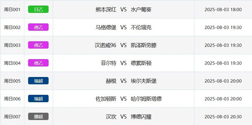 nba直播讯 北京时间8月1日,本周竞彩待开售安排如下,周五(8月1日)共2场,包括1场芬超、1场德乙。周六(8月2日)共16场,涵盖4场日乙、1场韩职、5场德乙、2场瑞超、2场挪超及2场芬超。周日(8月3日)共13场,包括1场日乙、3场德乙、3场瑞超、5场挪超及1场芬超。周一(8月4日)共3场,分别为2场芬超和1场瑞超。