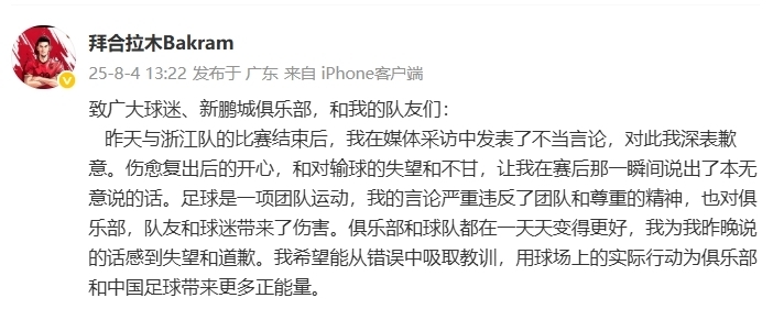 nba直播讯 北京时间8月4日,针对昨日深圳主场2-4不敌浙江的比赛后接受采访时对队友的批评言论,拜合拉木在社交媒体上发文致歉。