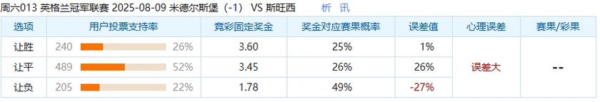 本场比赛中,选择米德尔斯堡让球负的球迷偏少了,只有22%的球迷选择让球负选项,这场比赛中,大家都看好主队米德尔斯堡能够赢或者大胜赢得这场比赛,不看好斯旺西能在客场保住分数,但是这也与奖金对应赛果概率的49%相差27%。