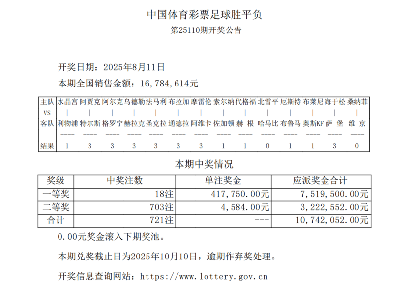 nba直播讯 8月11日,足彩第25110期开奖结果出炉。本期头奖开出18注,单注奖金高达417,750元,二等奖则有703注,单注奖金4,584元;任九开出6,195注,单注奖金1,530元。本期足彩总销量为16,784,614元,任九投注总额为14,816,584元,整体销售热度依旧高涨。