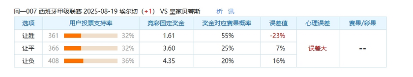 本场比赛中,选择埃尔切让球胜的球迷偏少了,只有32%的球迷选择让球胜选项,这场比赛中,大家都看好客队皇家贝蒂斯能够赢或者大胜赢得这场比赛,不看好主队埃尔切保住分数,但是这也与奖金对应赛果概率的55%相差23%。