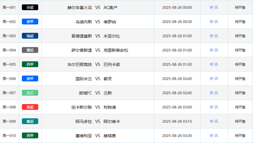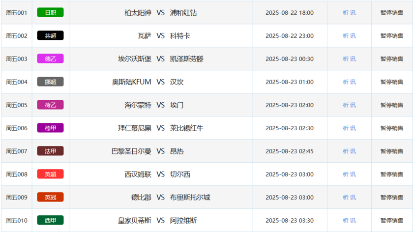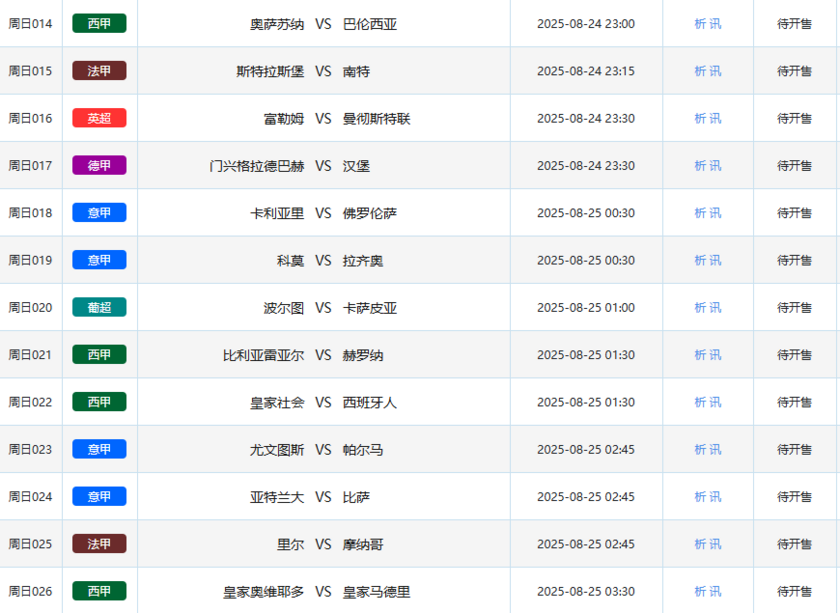 北京时间8月22日,本周五竞彩开售10场比赛,包括1场日职、1场芬超、1场德乙、1场挪超、1场荷乙、1场德甲、1场法甲、1场英超、1场英冠、1场西甲。本周六竞彩开售32场,涵盖3场日职、2场韩职、5场英超、2场英冠、6场德甲、2场荷甲、3场西甲、2场法甲、4场意甲、2场葡超和1场美职联。周日竞彩开售26场,包括1场日职、1场日乙、2场韩职、3场荷甲、1场瑞超、3场英超、3场法甲、2场德甲、2场葡超、4场西甲和4场意甲。下周一竞彩开售10场,共有2场意甲、1场法乙、1场挪超、1场英超、2场西甲、1场芬超、1场葡超和1场瑞超。