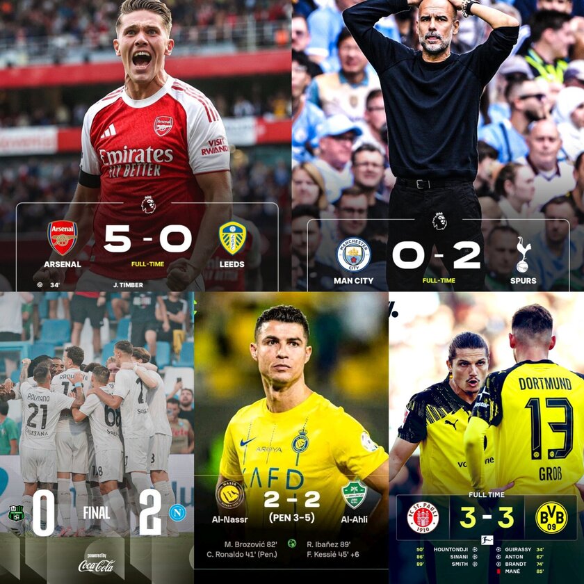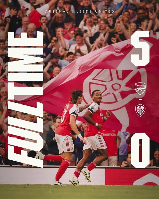 北京时间 8 月 24 日凌晨 0 时 30 分,英超第 2 轮,阿森纳坐镇酋长球场迎战利兹联。上半场,廷伯头球破门首开纪录,萨卡小角度抽射扩大领先,阿森纳 2-0 领先。下半场,约克雷斯内切抽射破门,廷伯头球补射再下一城,约克雷斯点射锁定胜局,最终阿森纳 5-0 大胜利兹联,登上积分榜榜首。