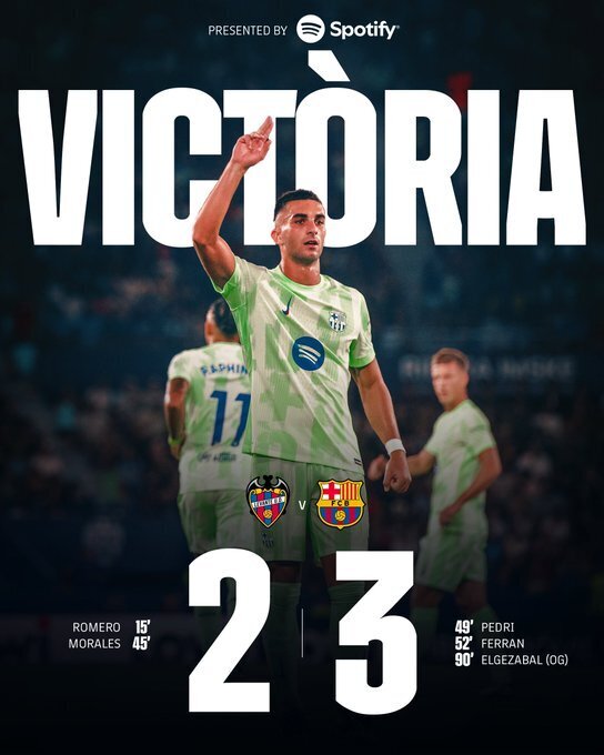 北京时间 8 月 24 日凌晨 3 时 30 分,西甲第 2 轮,莱万特对阵巴塞罗那。上半场,伊万 - 罗梅罗和莫拉莱斯先后进球,莱万特 2-0 领先。下半场,佩德里远射折射入网,费兰 - 托雷斯垫射扳平比分。补时阶段,亚马尔传中造成乌奈 - 伊尔格扎巴尔自摆乌龙,巴萨 3-2 绝杀莱万特,取得两连胜。