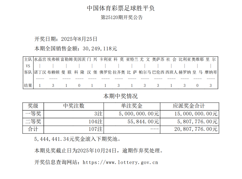 nba直播讯 8月25日,胜负彩第25120期开奖结果公布。本期头奖仅开出3注,单注奖金高达500万元,同时有544万余元的滚存奖金被带入第25121期竞猜。二等奖开出104注,单注奖金55,844元;任九开出1895注,单注奖金7048元。本期胜负彩总销量达到30,249,118元,任九投注总额为20,868,836元。