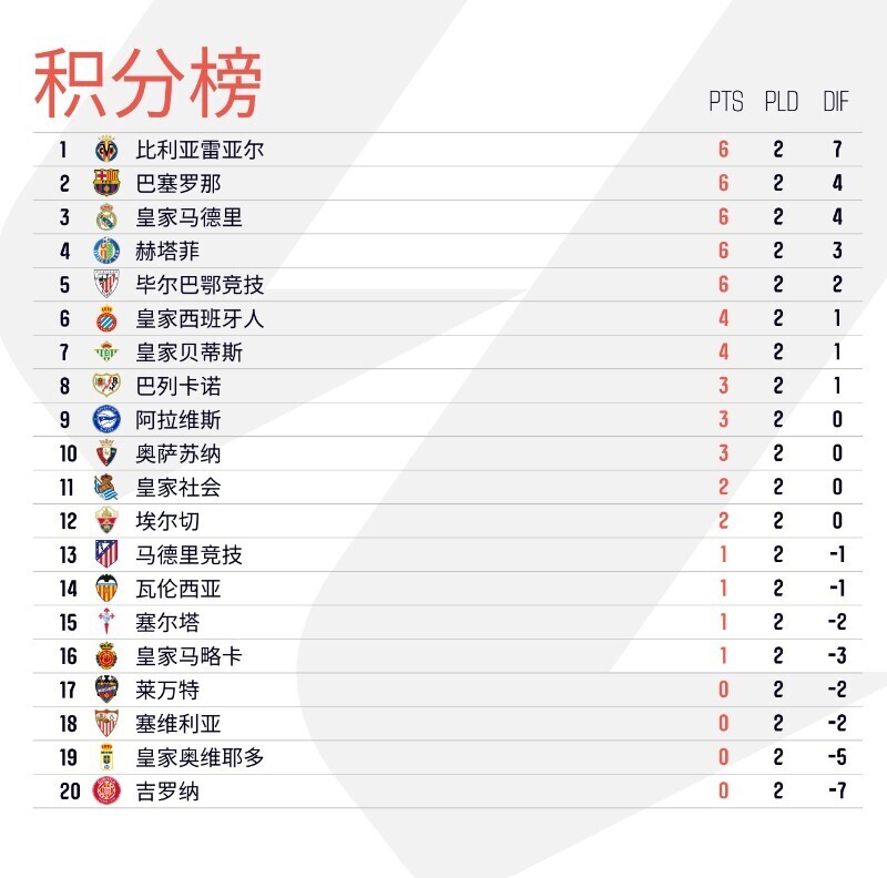 其他场次中,比雷亚雷尔5-0大胜赫罗纳,展现强大的攻击力;贝蒂斯1-0小胜阿拉维斯,马洛卡1-1战平埃尔塔,奥萨苏纳1-0击败瓦伦西亚;皇家社会与西班牙人2-2激战成和,毕尔巴鄂竞技1-0战胜巴列卡诺;塞维利亚1-2不敌赫塔菲,遭遇开局两连败。