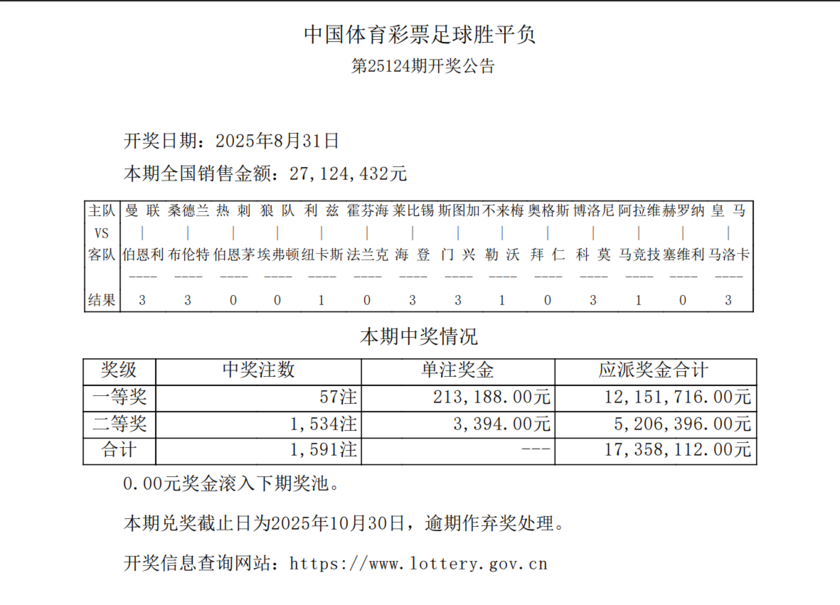 nba直播讯 8月31日,胜负彩第25124期开奖。本期14场一等奖开出57注,单注奖金213,188元;二等奖开出1,534注,单注奖金3,394元。任九开出10,661注,单注奖金1,359元。本期足彩总销量达到27,124,432元,任九投注总额为22,647,326元。