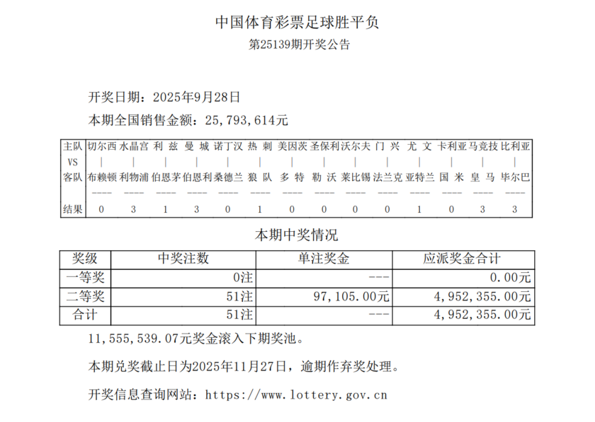 nba直播讯 9月28日,胜负彩第25139期开奖。本期14场头奖空开,1155万滚存奖金被带入第25140期竞猜。14场二等奖开出51注,单注奖金97105元;任九开出693注,单注奖金21256元。本期胜负彩总销量为25,793,614元,任九投注总额为23,016,756元。