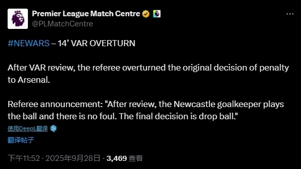 nba直播讯 在阿森纳对阵纽卡斯尔联的比赛中,第14分钟出现争议判罚。阿森纳前锋约克雷斯获得单刀机会,禁区内倒地,裁判最初吹罚点球。然而,经过VAR审核后,裁判推翻了点球判罚。英超官方表示:“经过VAR审核,裁判推翻了阿森纳队获得点球的判罚。” 裁判最终宣布:“经核查,纽卡斯尔门将先触球,没有犯规,最终判定为坠球。”