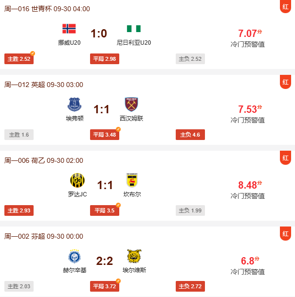 北京时间9月30日,为大家罗列各项足球让球胜平负和足球胜平负的赛事误差较大场次,各位球友敬请留意。