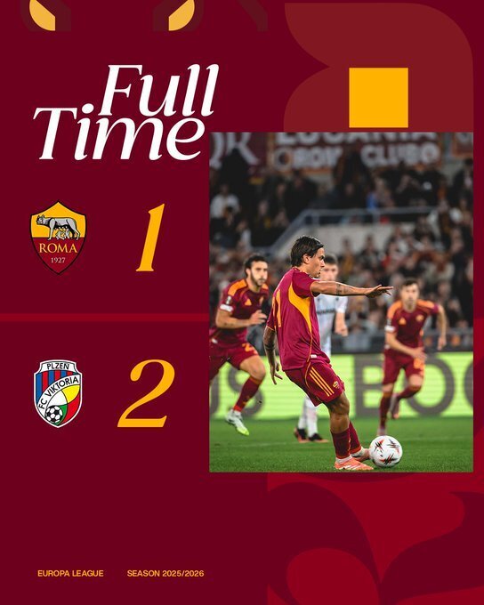 罗马1-2比尔森胜利:在2025-2026赛季欧联杯联赛阶段第3轮比赛中,罗马主场作战,面对实力远不如自己的比尔森胜利,他们上半场后防连续失误,两分钟内连丢两球,虽然后来迪巴拉通过点球扳回一城,但最终还是1-2落败,遭遇了欧联赛事两连败。