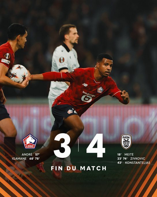 里尔3-4塞萨洛尼基:法甲劲旅里尔在主场对阵希腊超级联赛的领头羊塞萨洛尼基,上半场里尔就被对手打了一个3-0,下半场虽连追两球,但随后塞萨洛尼基再次扩大领先优势,尽管里尔最后又进一球,但还是没能逆转,最终3-4不敌对手,无缘欧联三连胜。