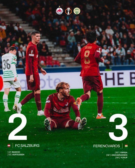 萨尔茨堡红牛2-3费伦茨瓦罗斯:萨尔茨堡红牛主场作战,率先进球的情况下,被费伦茨瓦罗斯在第50分钟扳平比分,随后费伦茨瓦罗斯在短短8分钟内连进3球,虽然萨尔茨堡红牛随后扳回一球,但也无济于事,最终2-3输掉了比赛。