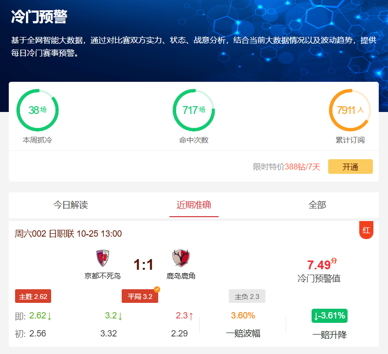 昨晚nba直播冷门预警工具再次成功预测3场比赛赛果,今日早场京都不死鸟VS鹿岛鹿角的比赛中,尽管初始赔率显示赛事分胜负概率较大(胜平负赔率2.62:3.2:2.3),但比赛最终以1-1爆冷战平;昨晚荷乙赫尔蒙德1:2负多德勒支、法乙兰斯0:0平特鲁瓦以及早场澳超纽卡斯尔喷气机5:2胜墨尔本胜利三场爆冷同样命中。一众预测充分展现了我们工具的精准预测能力。