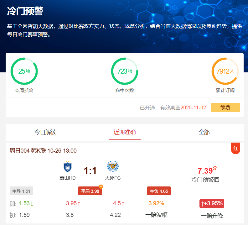 昨晚nba直播冷门预警工具再次成功预测6场比赛赛果,今日早场韩职蔚山HD VS大邱FC的比赛中,尽管初始赔率显示蔚山HD占优(胜平负赔率1.51:3.98:4.65),但比赛最终以1-1爆冷战平;昨晚西甲毕尔巴鄂竞技0-1负赫塔菲、意甲那不勒斯3-1胜国际米兰以及早场韩职水原FC 1-2负济州SK等六场爆冷同样命中。一众预测充分展现了我们工具的精准预测能力。