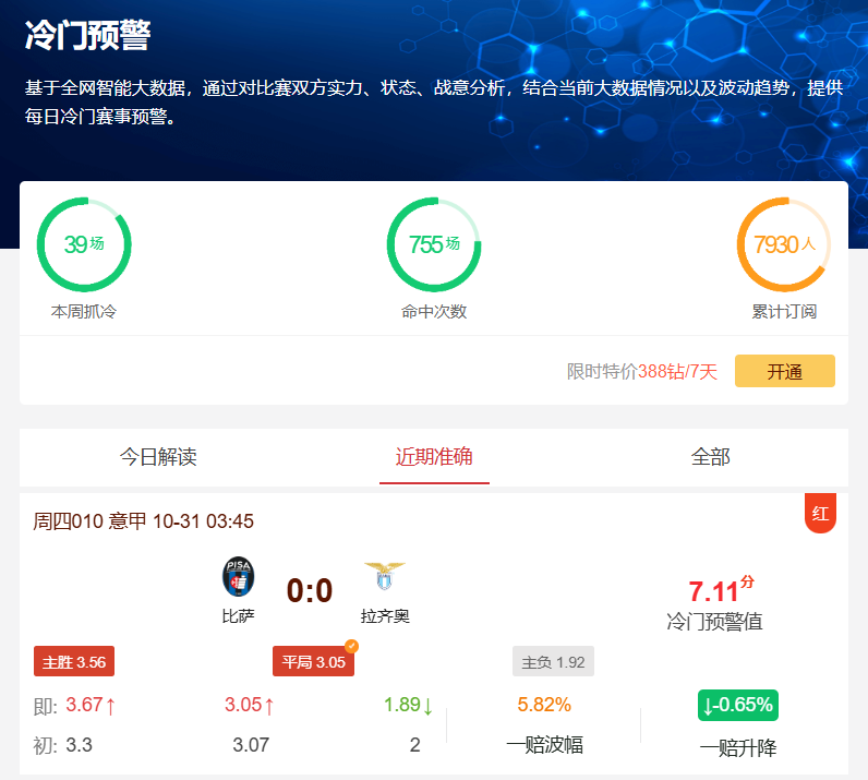 昨晚nba直播冷门预警工具再次成功预测5场比赛赛果,昨日芬超图尔库国际VS塞伊奈约基的比赛中,尽管初始赔率显示图尔库国际占绝对优势(胜平负赔率1.5:4.15:4.5),但比赛最终打出了2-2平的大冷门;同时意甲的比萨0-0平拉齐奥、卡利亚里1-2负萨索洛,沙特联达马克1-1平哈萨征服以及荷兰杯鹿特丹斯巴达5-2胜格罗宁根4场冷门结果同样命中。一众预测充分展现了我们工具的精准预测能力。
