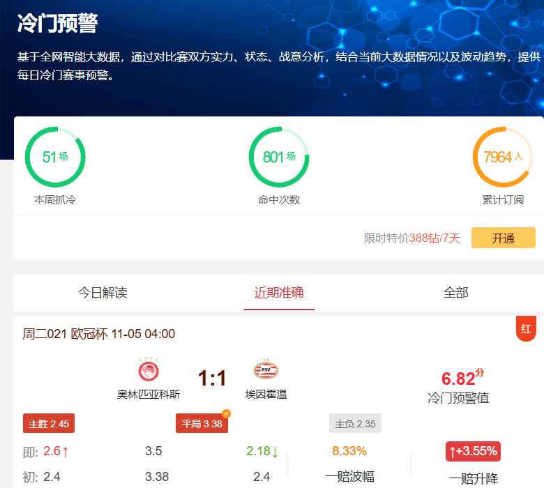 昨晚nba直播冷门预警工具再次成功预测6场比赛赛果,昨日奥林匹亚科斯VS埃因霍温的比赛中,尽管初始赔率显示双方分胜负概率较大(胜平负赔率2.45:3.38:2.35),但比赛最终打出了1-1平的冷门;同时早场亚冠首尔FC0:0平成都蓉城以及英冠布里斯托城0-1负布莱克本、莱斯特城1:1平米德尔斯堡还有欧冠博德闪耀0-1负摩纳哥、尤文图斯1-1平葡萄牙体育等多场冷门结果同样命中。一众预测充分展现了我们工具的精准预测能力。