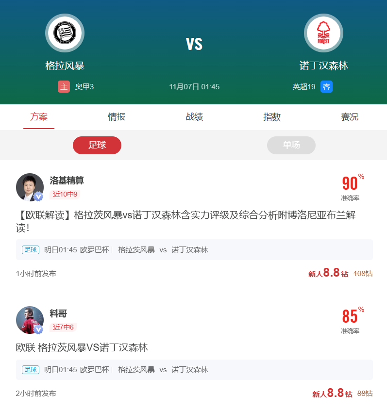 周四009欧罗巴推荐:格拉茨风暴VS诺丁汉森林