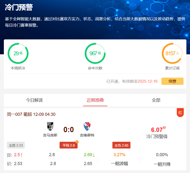 昨日葡超吉马良斯VS吉维森特的比赛中,尽管初始赔率显示双方分出胜负的概率较大(胜平负赔率2.53:2.8:2.65),但比赛最终打出了0-0平的冷门。昨日早场韩K联水原FC2-3负富川FC(胜平负赔率1.79:3.35:3.68)、意甲乌迪内斯1-2负热那亚(胜平负赔率2.2:2.8:3.15)的比赛也同样命中。一众赛果充分展现了我们工具的精准预测能力。