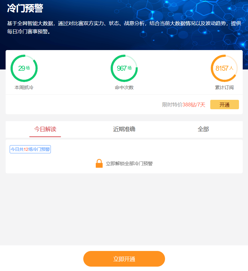 【冷门预警】发布高能警报:今日多场重点赛事冷门指数爆表,部分场次冷门预警值已达到7.4分速来锁定详情!