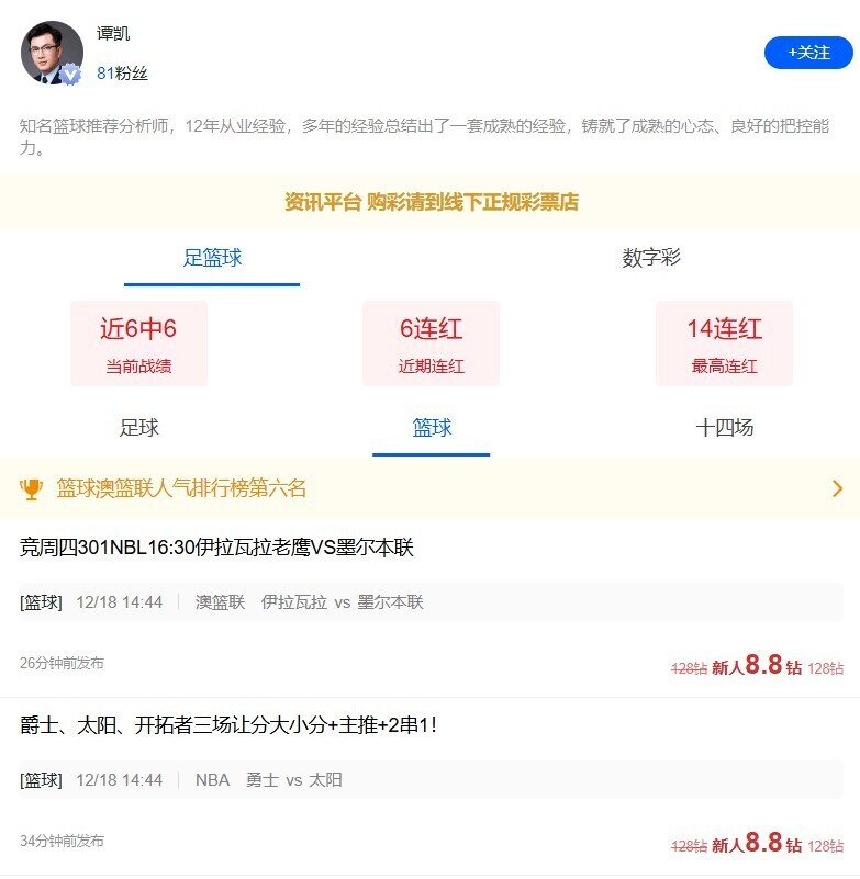 谭凯六连红!今日篮球推荐已发车,速速点击查看