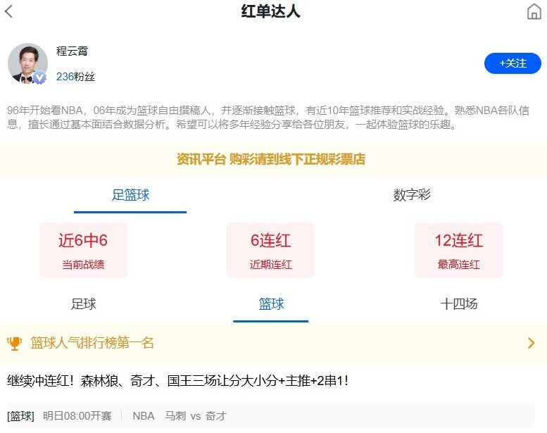 程云霄六连红!今日篮球推荐已发车,速速点击查看