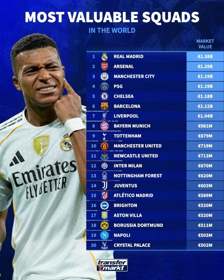 这份榜单客观反映了当前欧洲足坛的球队实力与球员价值格局。皇马凭借以姆巴佩、贝林厄姆、维尼修斯等年轻巨星为核心的阵容,在总价值上遥遥领先。英超球队展现出强大的整体财力,共有六支球队跻身前十,且阿森纳、曼城、切尔西三队身价均超过11亿欧元,竞争异常激烈。